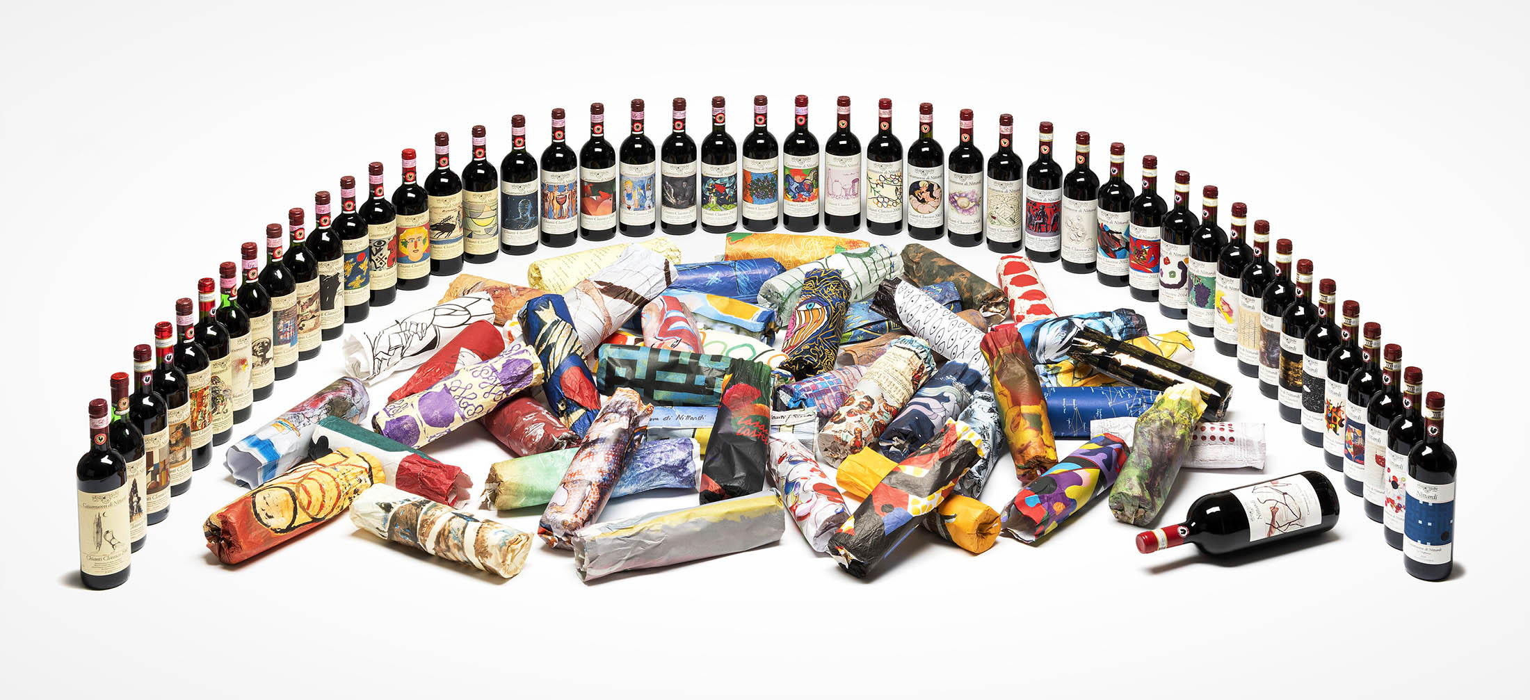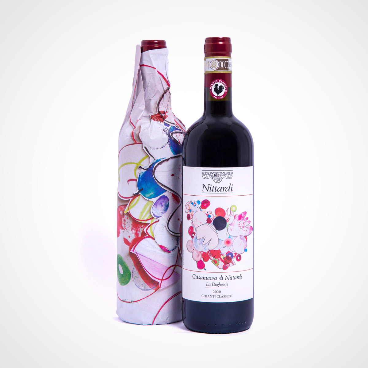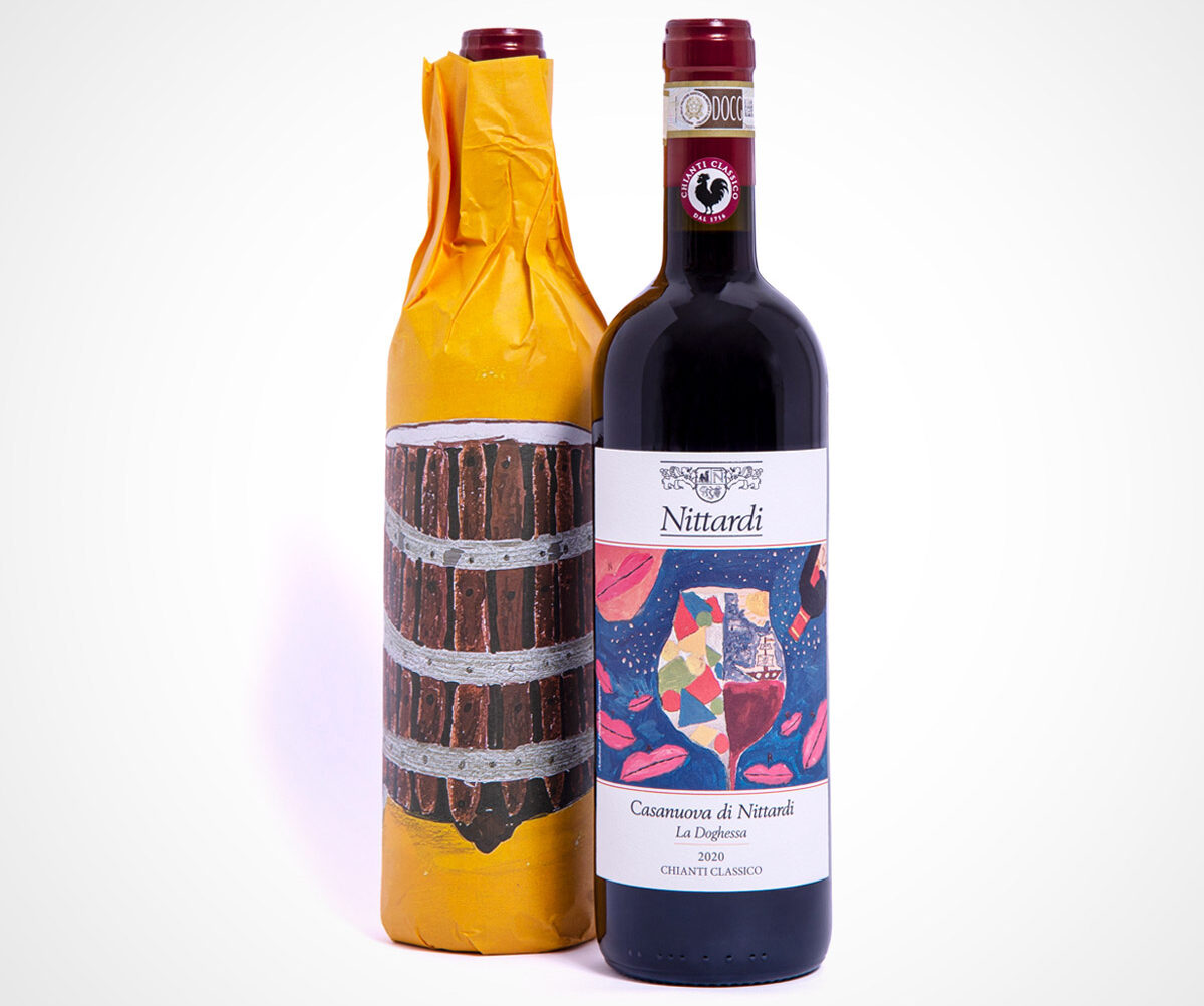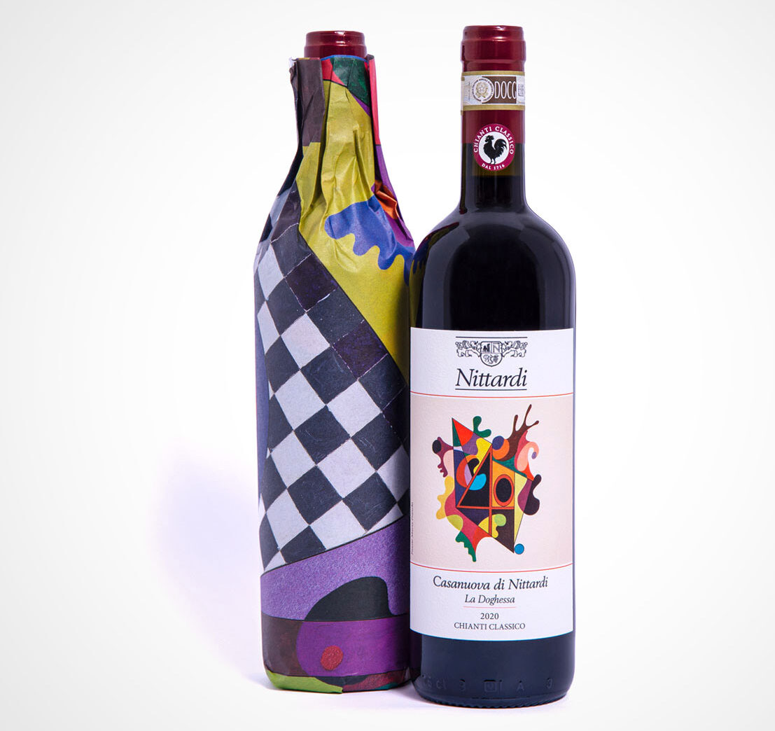 And in this tradition, with Chianti Classico Casanuova di Nittardi 2020 we are celebrating 40 years of a precious collection of artist labels and wrapping papers. Since 1981, a literal Who’s Who of the international art world has honoured Nittardi with artworks: Tomi Ungerer, Yoko Ono, Dario Fo, Emilio Tadini, Günter Grass, Hundertwasser and many others have created two works for Nittardi, one for the label and one for the tissue paper within which the bottle is wrapped. A tribute to Michelangelo, the illustrious previous owner of Nittardi, and to the visual arts – and to the nectar of the gods.
